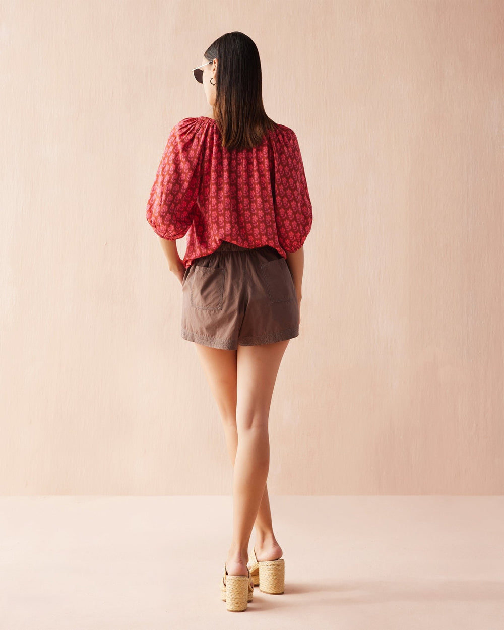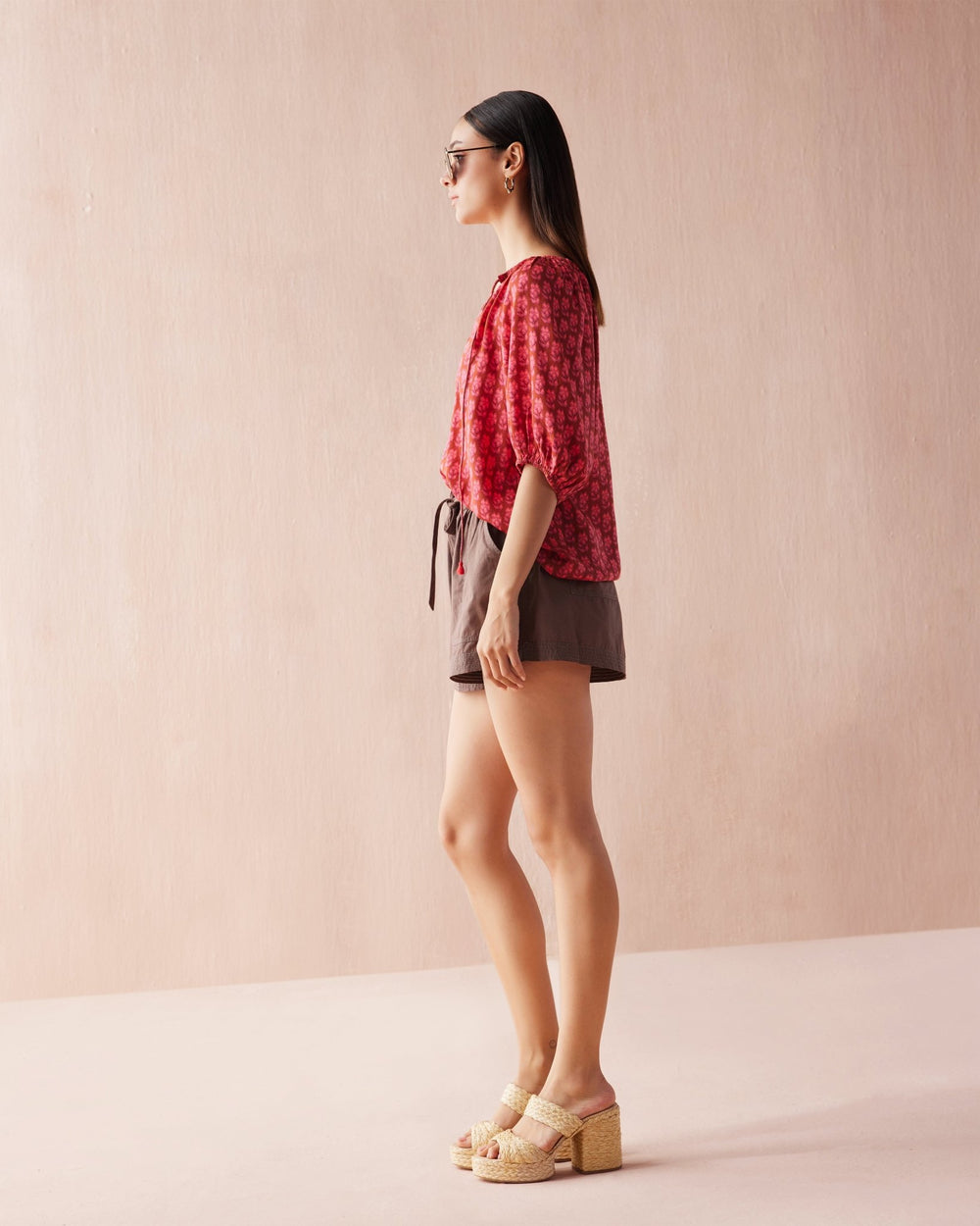 - V-neck with tie closure; can be worn open or tied