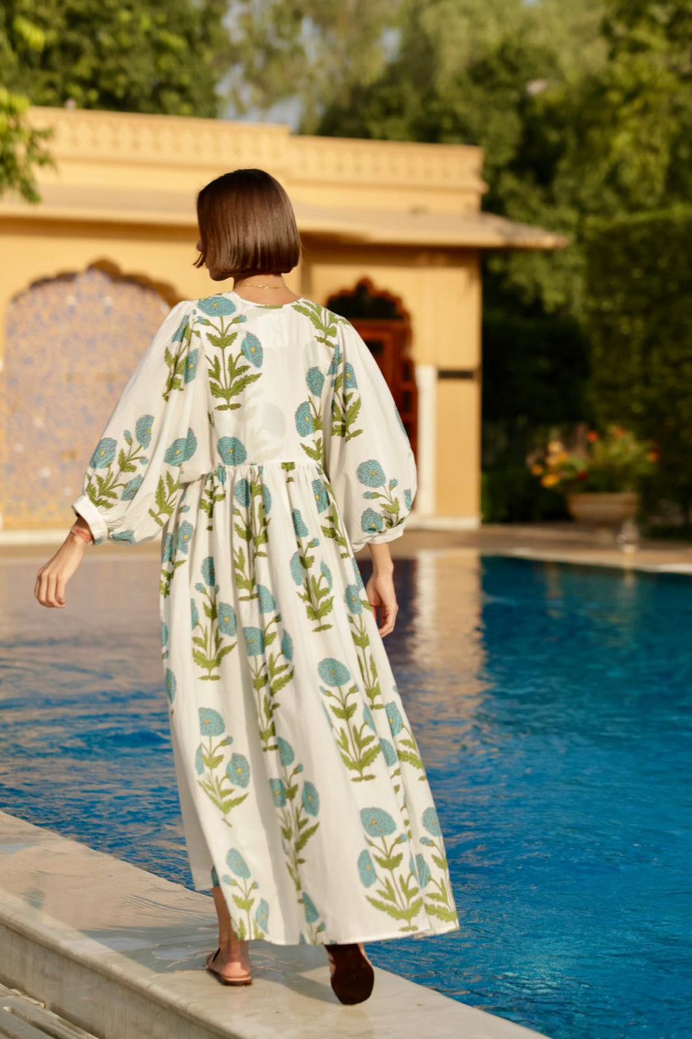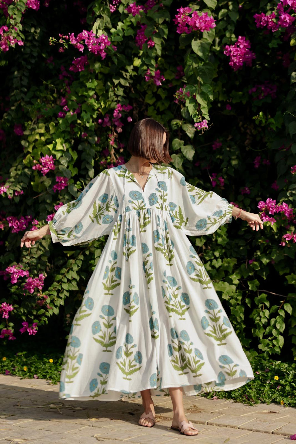 Our Taj Maxi Dress, crafted from feather light cotton voile has a beautiful and flowy drape. The botanical display of palms or flowers makes this dress an elegant option for all seasons. Details of the dress includes a front tie at the neckline, hidden side seam pockets, and graceful billowing ¾ sleeves.