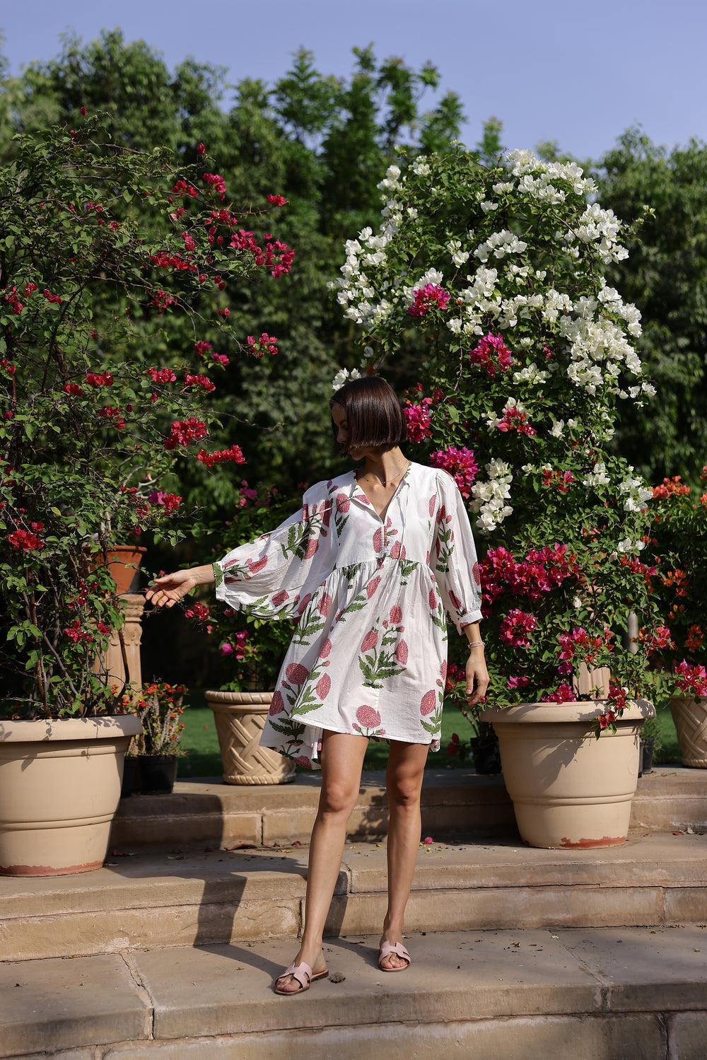 Our Taj Mini Dress, crafted from feather light cotton voile has a beautiful and flowy drape. The botanical display of palms or flowers makes this dress an elegant option for all seasons. Details of the dress includes a front tie at the neckline, hidden side seam pockets, and graceful billowing ¾ sleeves.