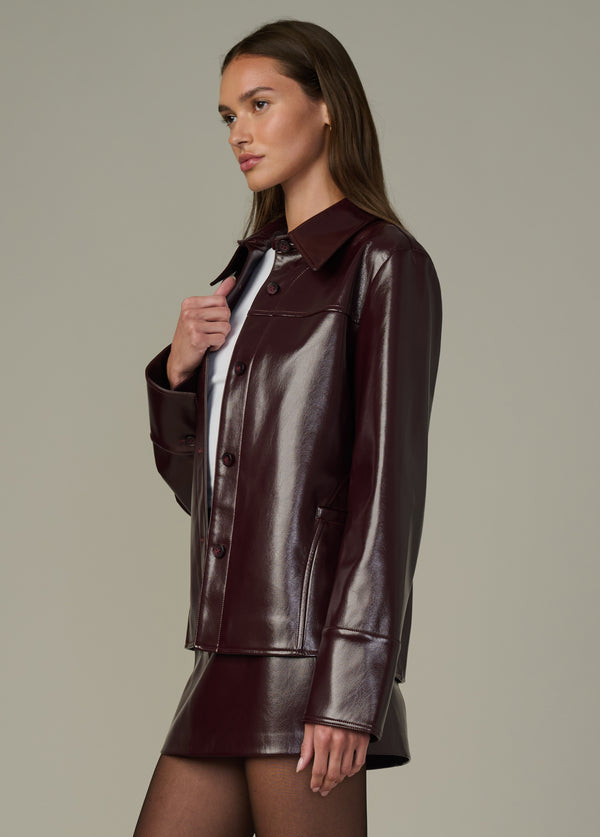 Our vegan leather updated with a luxe patent finish with high shine in a deep burgundy color with warm undertones.