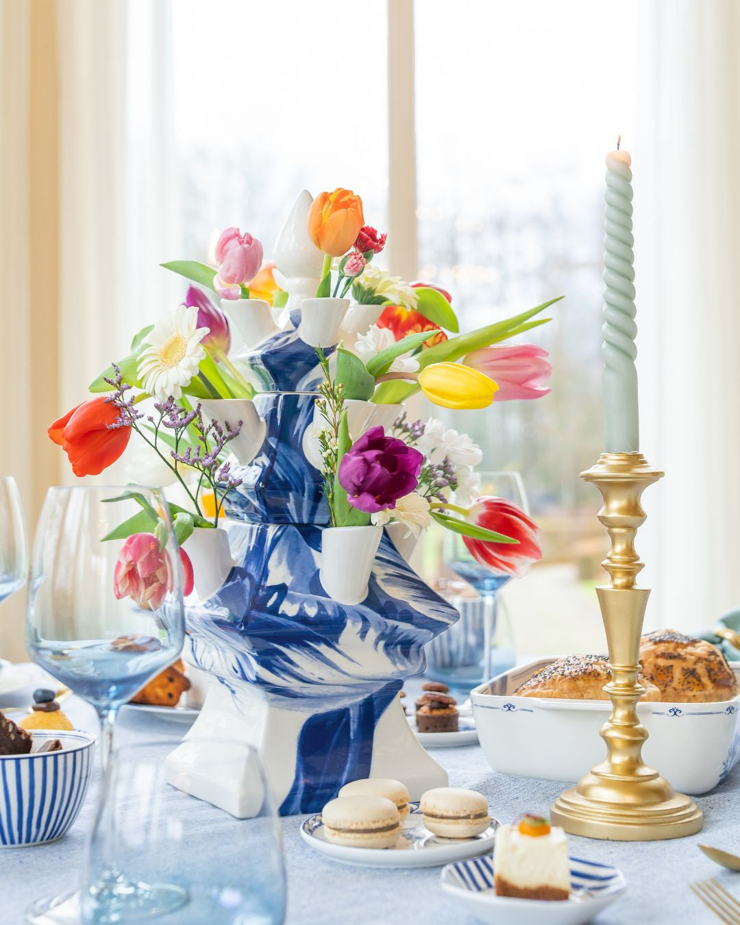 The tulip vase is probably the most iconic Delft blue vase there is. Throughout the centuries the tulip vase made multiple transformations, but the essence of the design never changed. This modern version of the original 3-tier tulip vase is part of our Sharing Moments collection by Janny van der Heijden. The queen of the kitchen created her own tableware collection with lush tulips and hilarious monkeys. She now added a collection of vases tot he tableware set. This way you can complete your beautifully set dinner table. This 3-tier tulip vase has three different parts which can be separated from one another. Every part has it’s own water container so the flowers stay fresh for a longer time. The tulip vase has a modern look and is decorated with a Delft blue lush tulip, painted in the style of a watercolor painting. A stunning decorative piece, with or without flowers.