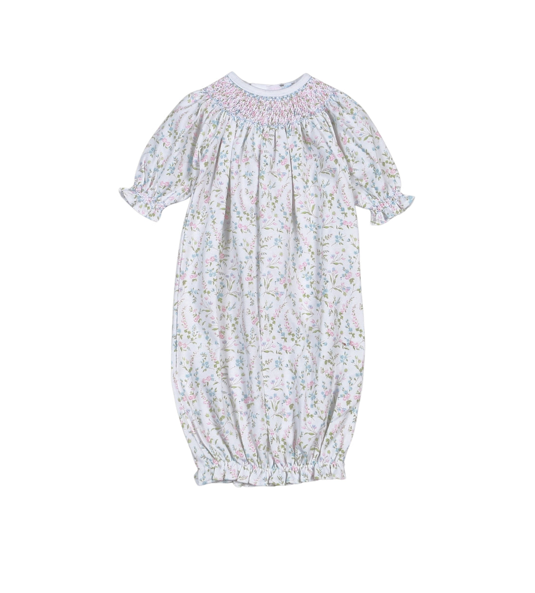 The Vivian Floral Hand Smocked Bishop Gown showcases expert craftsmanship with delicate hand smocking and a timeless bishop sleeve design. Its floral pattern adds a refined, elegant touch, making it ideal for special occasions or sophisticated everyday wear. This gown combines classic style with meticulous detail, ensuring both comfort and a graceful silhouette.